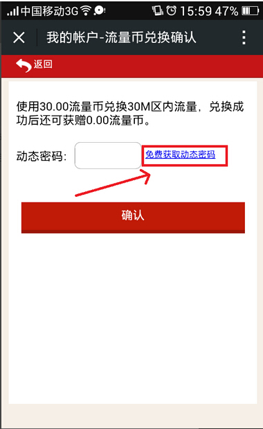 点击兑换30流量后,会有一个验证码的验证,你只要点击“免费获取动态密码”就会有验证码发送到你的手机上,只要把验证码填上,最后的就是你已经兑换免费流量成功了。