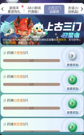 6月14日-6月19日活动期间,只要抓捕指定数量的星宿妖灵,即可获得上古符印宝箱,唤醒上古三门!