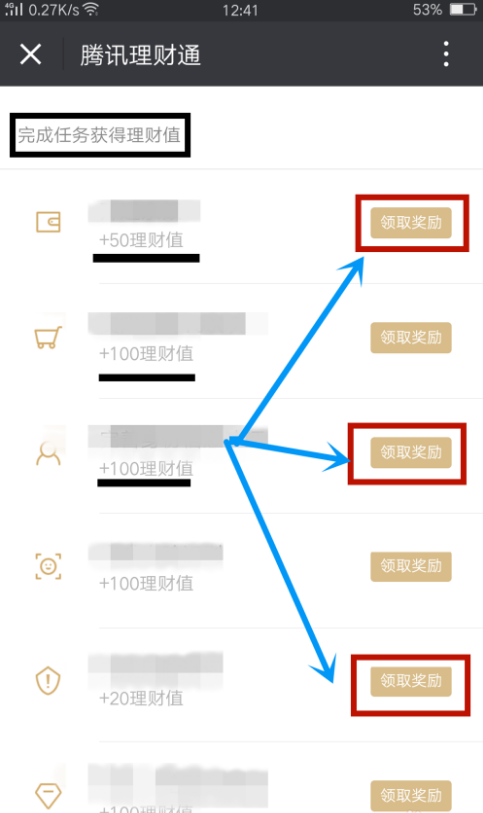 5、然后上翻屏幕在完成任务中领取理财值,点击“领取奖励”即可,如图所示,