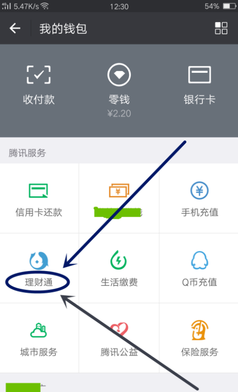 2、在钱包页面,再点击进入“理财通”,如图所示,