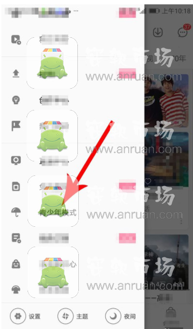 2、侧边栏后向下滑动,找到“青少年模式”,点击进入。