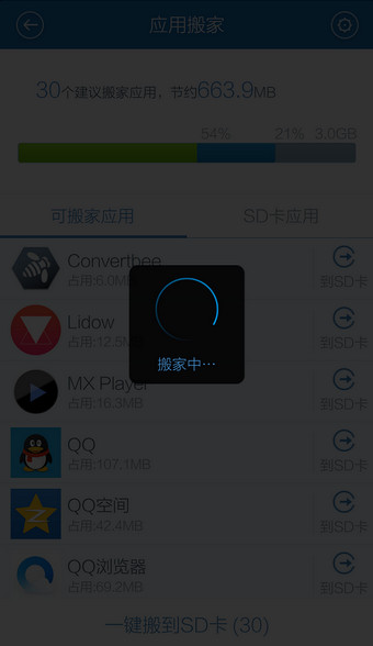 3.显示【可搬家应用】,可选择将某个APP搬到SD卡或者【一键搬到SD卡】