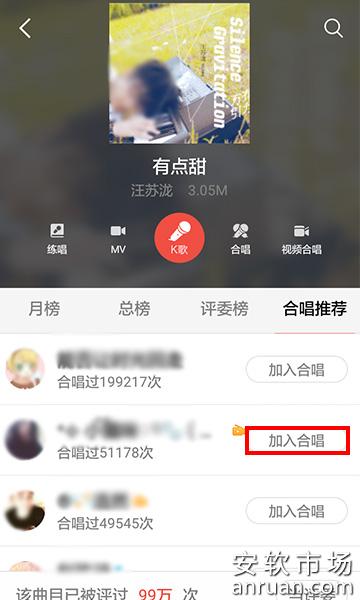 2、找到自己喜欢的歌曲,如果想唱就点击那一首歌进入,这个时候会有很多选项,我们选择合唱推荐,找到自己喜欢的合唱者(他或她),点击右边的“加入合唱”即可进入合唱。