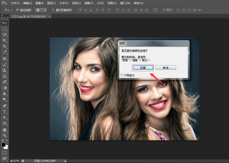 点击菜单栏的图像——模式——灰度命令,在弹出的对话框里选择【扔掉】,