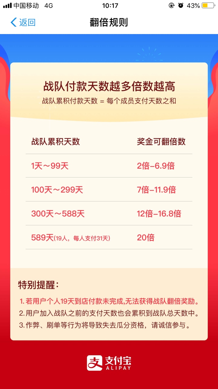 每个队伍最多19人,加入战队后用户不能退队,一个用户最多加入一个战队。战队成员进行到店付款累积天数,战队总到店付款天数=每个成员支付天数之和。战队成员总到店付款天数越多, 获得翻倍倍数越高。