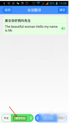 7、摄像头翻译的内容就讲完了,我们再看看会话翻译吧,进入百度翻译的主页之后点击下半部分的”会话翻译“进入。这里都是语音操作,比如我现在想和美国人对话给他打个招呼但不知道怎么说。直接打开软件点击”请说中文“我想说:”美女你好,我叫先生“。之后等待一下就可以看见翻译之后的英文了,而且会自动语音播放出来