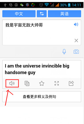 8、最后再来学习最简单的文字翻译功能,直接在最开始的文本框输入想要翻译的文字”我是宇宙无敌大帅哥“输入这句话之后我们点击”翻译“就可以看见翻译后的英文了,点击喇叭也可以播放英文