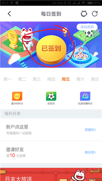 4、在这里你就能进行签到,如果已经签到了,那么这里就会显示已签到三个字!