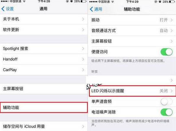 2、然后我们点击【辅助功能】然后点击【LED闪烁已示提醒】