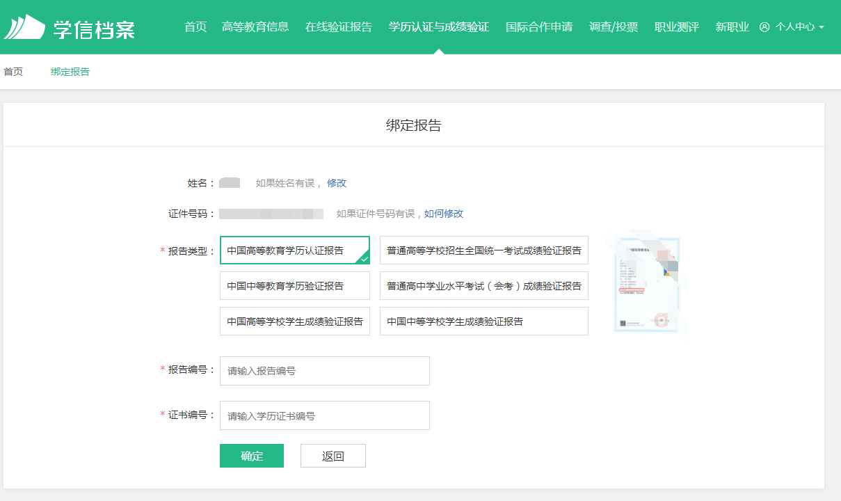 4、选择报告类型,根据你的图片绑定相关的类型,绑定完成后,即可查询相关的学历信息。