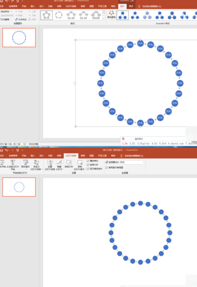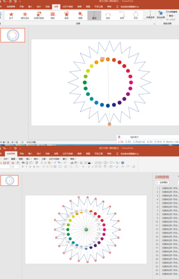 播放幻灯片,欣赏圆形运动、造型变幻的奇妙效果。路径不同,延迟时间不同,变幻效果也不同。