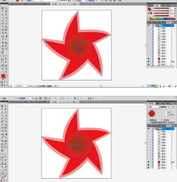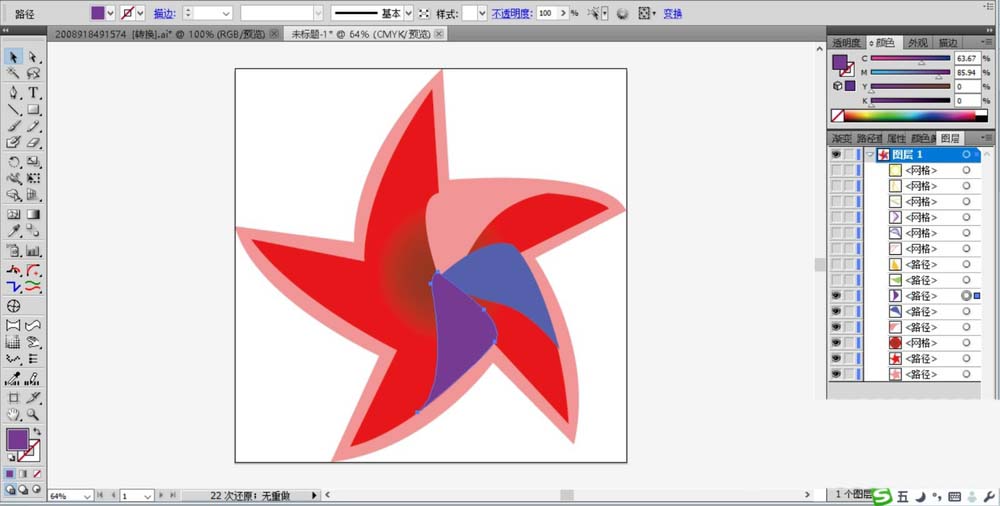 2、用红色跟粉色搭配填充风车的内外两个主体路径,中间圆形用网格工具做出红到灰黑色渐变效果。