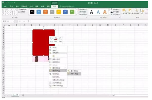 10、然后点击鼠标右键,找到置于底层-下移一层功能,然后红色长方形就会下移到证件照后面,成为证件照背景。