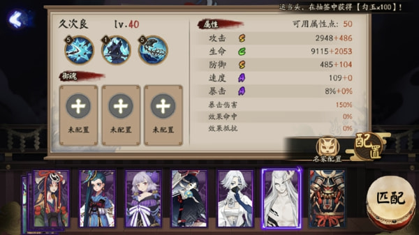 久次良的面板可以看出来,他并不是一个注重输出的式神,虽然是C级的生命,但是防御却是达到了S级。就这属性特征可以看出,久次良和大岳丸类似,都是在输出的同时兼具了防守,都是攻守兼备的输出式神,不亏都是来自铃鹿山的妖怪。