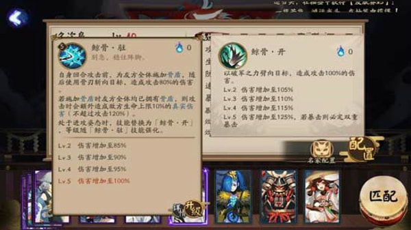 从普攻我们又能看出,久次良也是一个双形态的式神(跟大岳丸一样),“驻形态”在100%的伤害的同时,还有可能造成生命上限10%的真实伤害。而“开形态”则是非常单纯的爆发伤害,看似125%的伤害加成,但是“双重暴击”的设定,让久次良的普攻十分爆炸!
