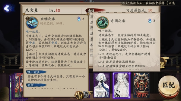 鱼鳞之备和方圆之备既然是“双形态”的式神,三技能便是切换形态的关键。“守形态”下,久次良会为全体队友提升20%的效果抵抗和防御,并在回合结束后有高概率获得骨盾或者回血,若是在“守形态”释放该技能,久次良会拉动全队15%的行动(对自己拉动60%),然后切换到“攻形态”。