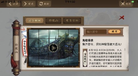 大人们可通过微博平台寻找大岳丸密令的相关线索并进行获取密令。将的密令输入对话框内并进行提交,即可解锁对应拼图。当所有拼图解锁,大人们将寻到鬼船,并有机会赢得宝藏。