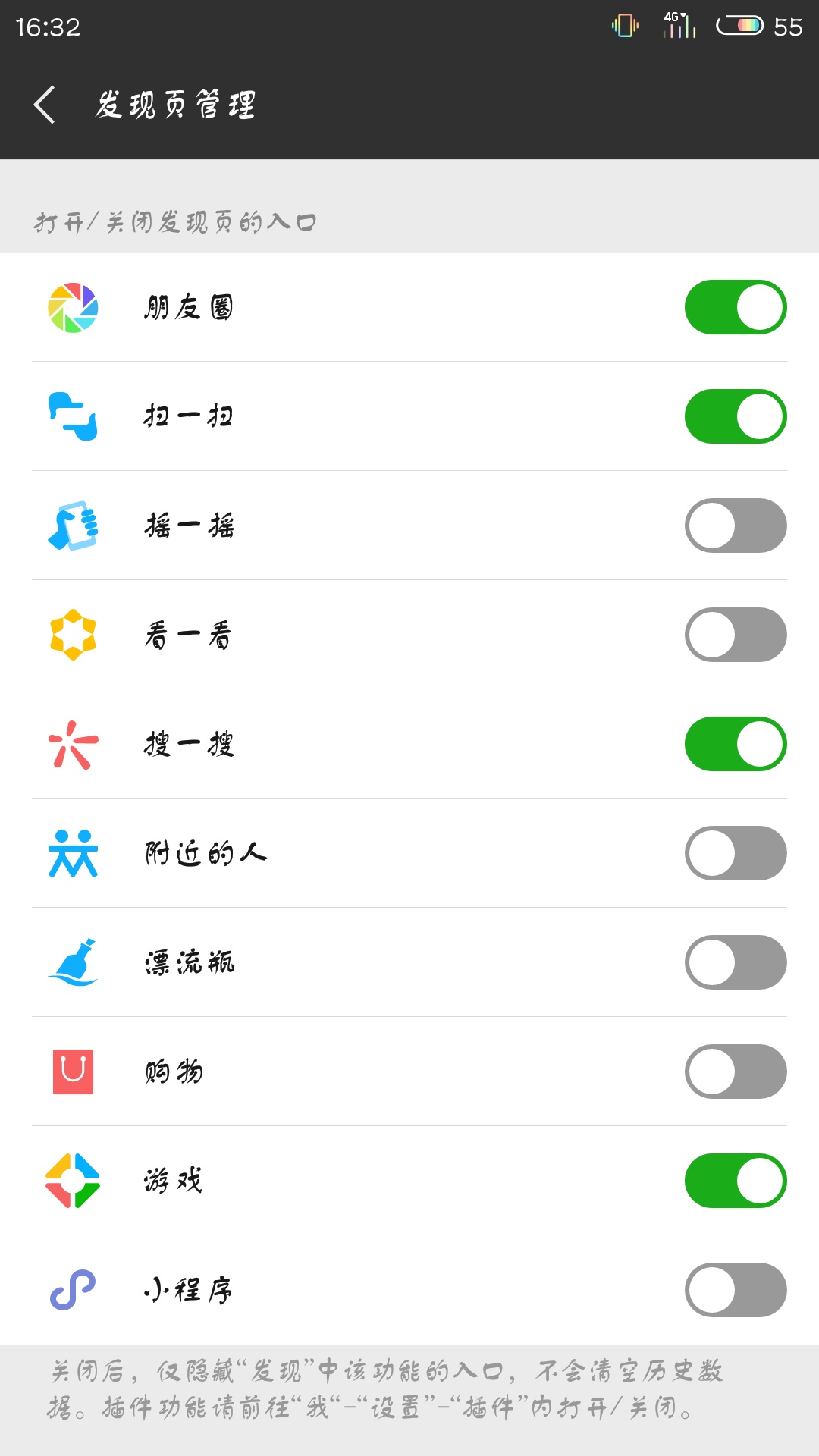 3、然后找到“发现页管理”,可以看到在发现页管理中有”打开/关闭发现页的入口“,包括朋友圈、扫一扫、小程序等,点击小程序后面的开关,微信小程序入口就关闭了;