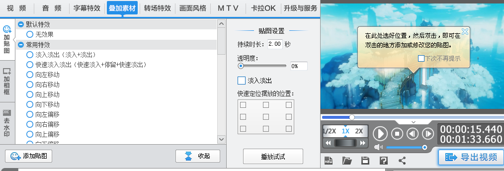 2、点击上方的【叠加素材】,在这个页面的左边有三个选项【加贴图】【加相框】【去水印】