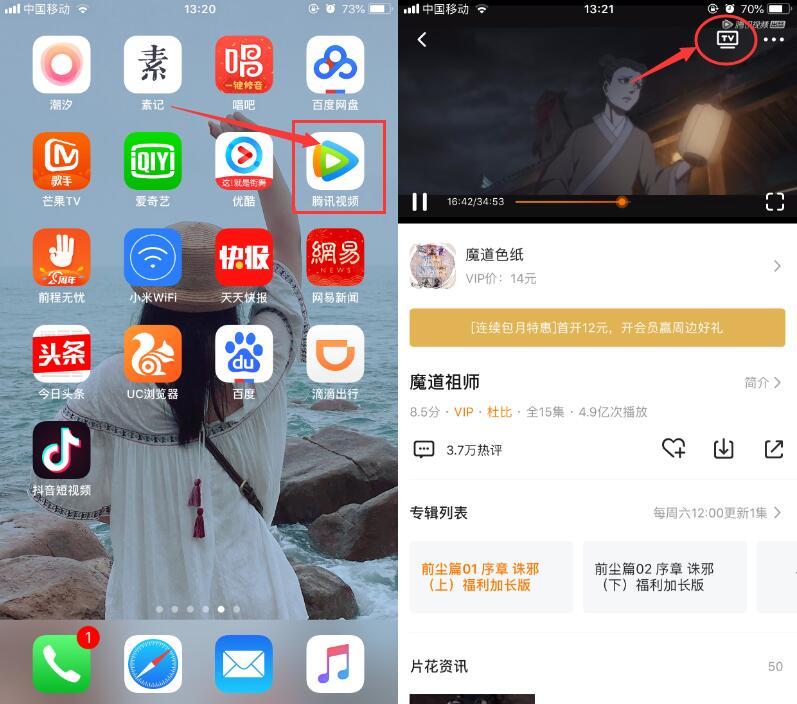 2、在视频小窗口的右上角看到"TV投屏按钮",点击这个图标,连接电视或盒子型号,就立马将这个播放中的视频推送到电视端了。