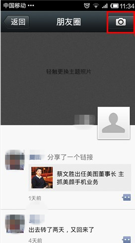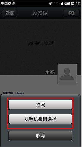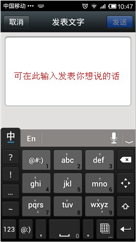 ②如果你只是轻轻一按照相键的话,就会弹出拍照和从手机相册中选择,这样就不是发表纯文字了,而只要按住右上角的相机按钮2-3秒钟可会弹出发表文字的对话框,这样的话你就可以只配文字而不发图片了;