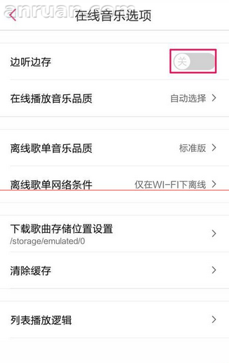 4、在线音乐选项中可以看到这里的边听边存默认是开启状态,点击以后,关闭即可。