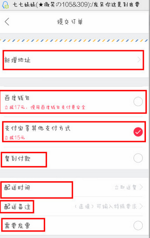 3、首先填写你的送餐地址,然后选择支付方式:如果你是有百度钱包不妨可以用百度钱包,因为优惠最大,其次就是支付宝,餐到付款是没有优惠的。