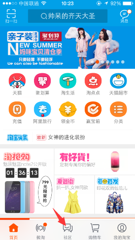 1、打开手机淘宝,进入首页点击【社区】按钮,跳转到社区页面后点击【摇一摇】。