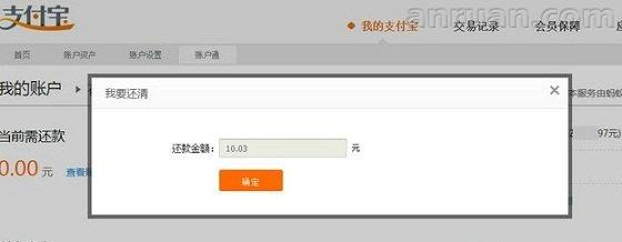 第三步:然后再输入还款金额,点击确定后到收银台页面,支持还款渠道:余额、余额宝、储蓄卡快捷、储蓄卡网银,完成点击“确定”即可。
