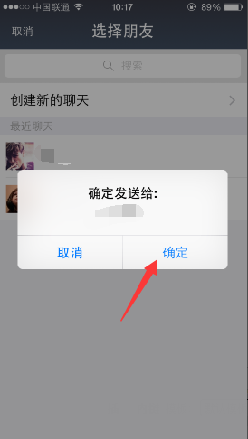 2、点击后会跳转到【选择朋友】界面,选择需要转发的对象,最后按【确定】按钮即可完成转发信息