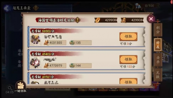 鬼王被击杀后,发现者、伤害最高者以及最后一击者都会获得额外奖励,活动期间所有战斗所得的积分将折算一定比例后共享给好友作为海国首领退治好友奖励。