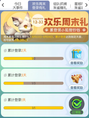 周未累登,欢乐领好礼!6月22日-6月24日,累计登录达到指定天数,即可获得小狐狸铃铛!