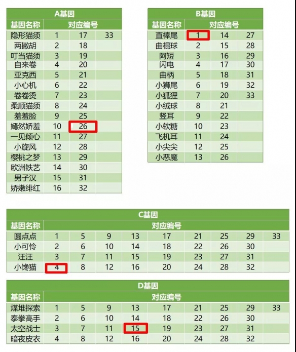 本次共有37个基因进入侏罗纪套装猫基因配方备选池中,分别对应不同的编号,并被分入A、B、C、D四个基因池。
