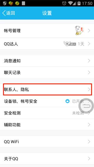 打开手机QQ设置页面后,在下面的选项中,选择“联系人、隐私”。