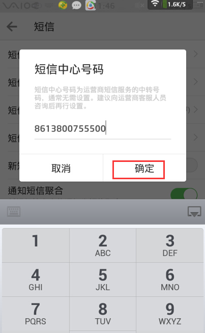 6、输入短信中心号码,点击“确定”即可更改。注,不同的地方有不同的短信中心号码,如果想知道自己地方的短信中心号码,如果是移动的,可以搜索“各地移动短信中心号码”。搜索后对应找到,其他联通、电信等也可以用同样的方式查找。