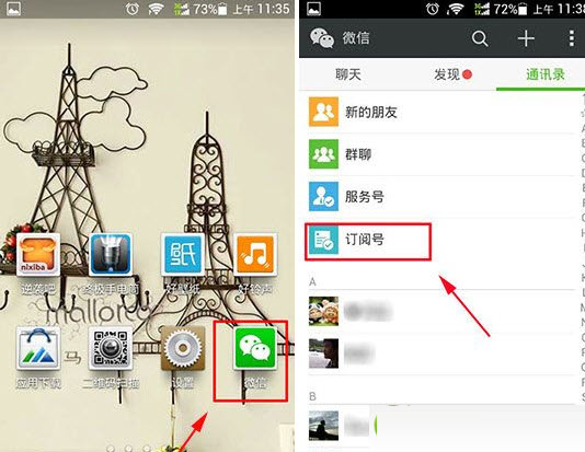 1、首先打开“微信”,然后在“微信”的通讯录中点击进入“订阅号”。