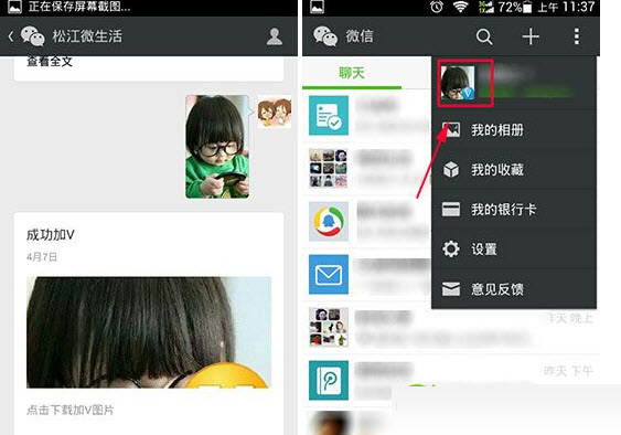 3、在你刚关注松江微生活订阅号中,发你想要加V的图片,一会儿就会发现“成功加V”的回复,下载你喜欢加过V的图片,然后把你下载的换成你的微信头像,然后就会发现你的微信头像已经成功加V了。