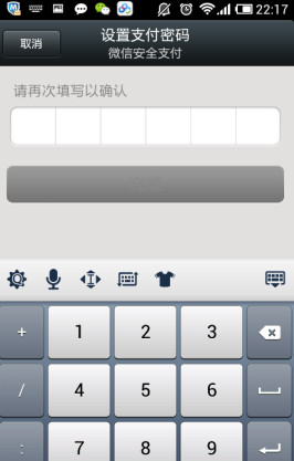 4、在设置支付密码页面,设置支付密码,自动进入第二次输入密码页面。