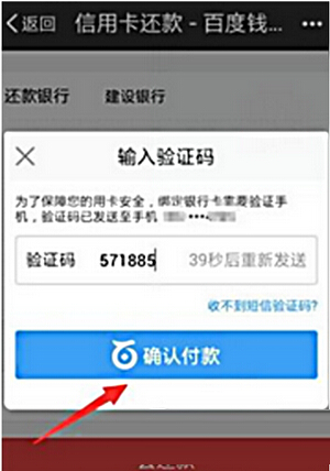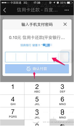 6、百度钱包就会自动选择绑定的银行卡进行信用卡还款,按照如图的要求输入你在百度钱包设置的支付密码,再点击“确认付款”。