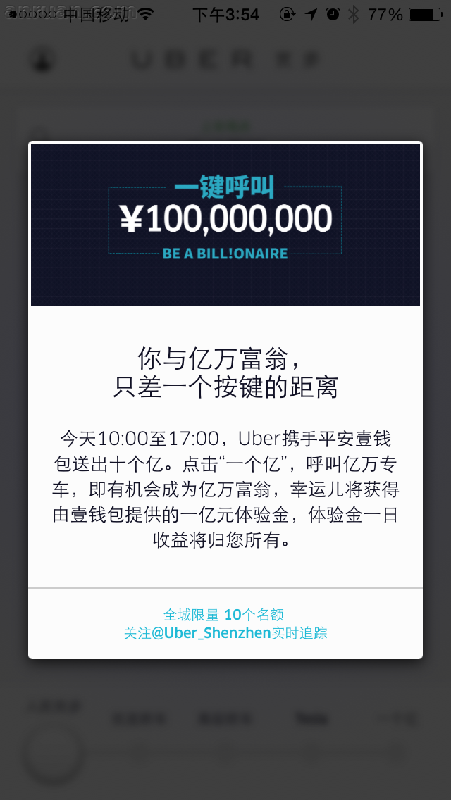 打车服务越来越普及的今天,优步的活动当然也是不能少,比如今天的抢红包活动: