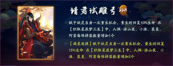 赋予妖灵自身一次重生机会,重生时回复15%生命在【织取星辰梦三生】中,人偶一涂山夜、小渔、 裴旻、阿蛮每堆掉落数量增加2个