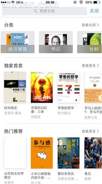 3、如果你有自己特别想看图书可以直接搜索得到,也可以选择热门推荐里的书。或者按分类来找书你喜欢的图书。根据自己的个人爱好选择即可。