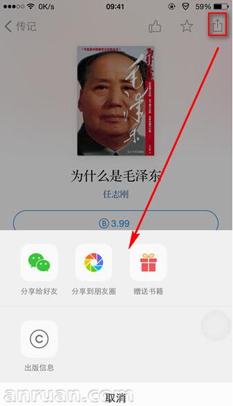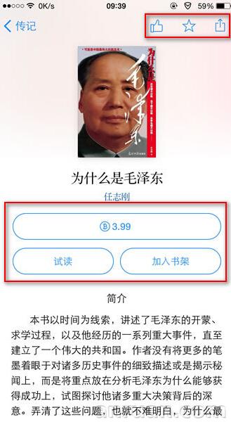 4、当你找到了做自己要看的书籍,点击书籍名称,可以选择试读或者放入书架。如果你觉得这本书不错还可以分享给自己的微信好友或者朋友圈,还能查看到书籍的出版信息当然也可以选择赠送书籍给自己的朋友。