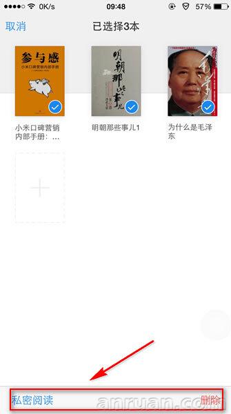 8、如要书架中的书不想要了怎么办,可以直接按住书籍不松手,然后选择要删除的书籍即可。当然也可以设置为私密阅读。