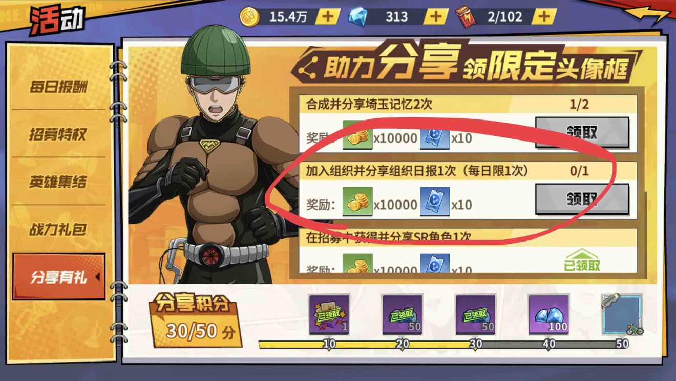 分享活动中合成并分享埼玉记忆这一项基本没有什么特别的难度,而招募获取并分享SR在有新手保底的加持下也容易实现。让玩家不得不卡住进度的主要就是分享组织日报这一条,不管是加组织还是分享都可能是难点。