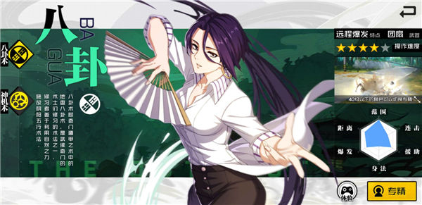 八卦术专精是通过八卦之术驾驭金木水火土五行元素来对敌的,火烧、水淹等攻击手段都非常的凌厉,所以在战斗中主要负责对敌人造成大量的伤害,尤其是在BOSS战斗中该专精的爆发能力极强。不过,一支队伍中自然不会只有一个担任输出任务的门派,但她更加肩负着决定刷图效率的重担,技能的命中率、定三奇的使用是否合理,都严重左右着战局的变化。