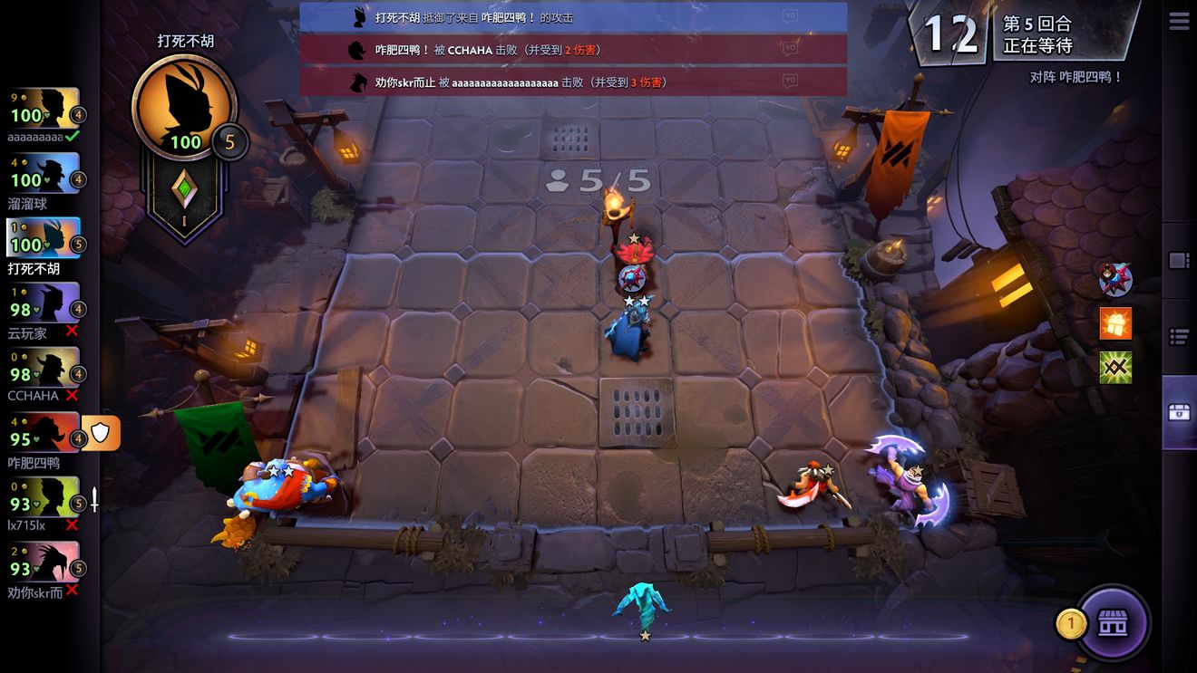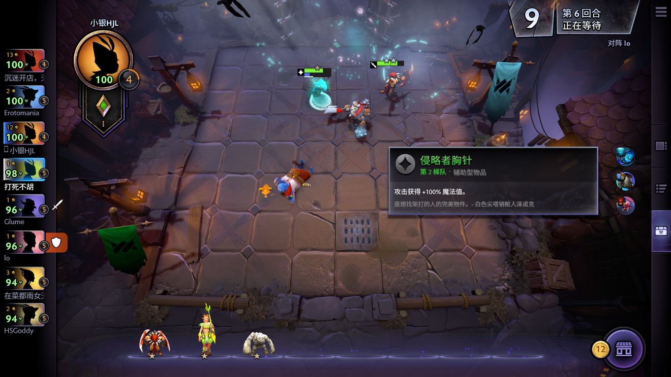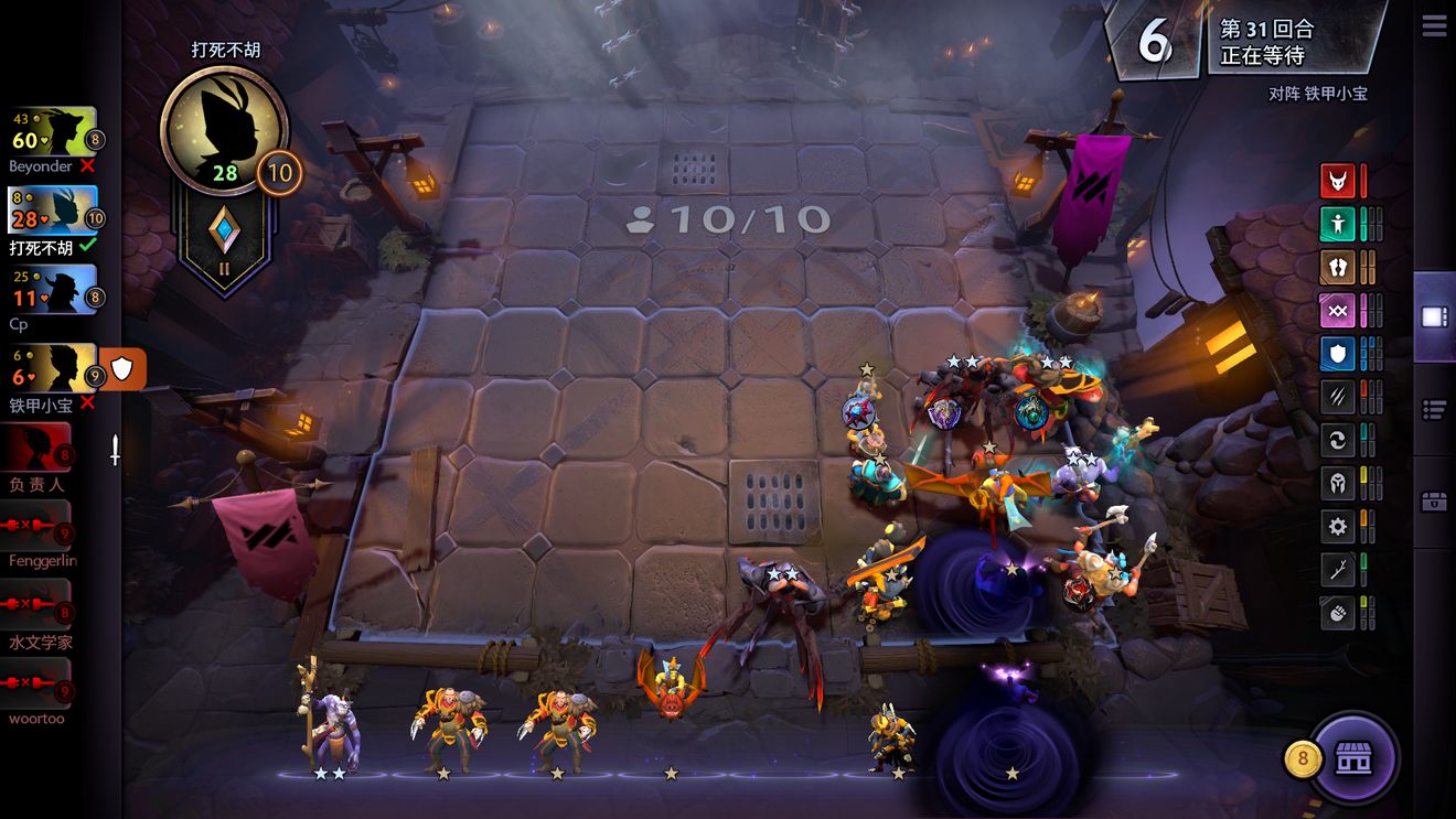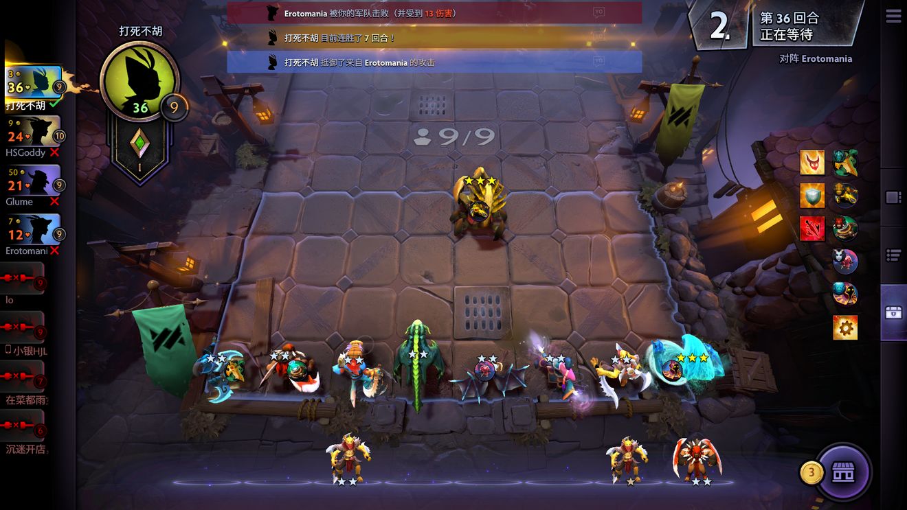 前期连败保经济,靠三地精撑过前中期,一路到9人口开始爆发,直接转型9刺客,第36回合,楼主依旧保持着连胜,pa因为暴击几率太低不适合再做刺客核心,取而代之的是血魔,ta等强势单卡。