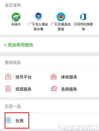 2、接着在“五险一金”里打开【社保】,点开【xx市社保查询】