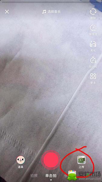 1、打开抖音点击底部的【+】然后选择选择【上传】;