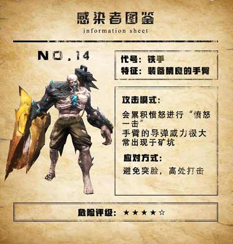 在《明日之后》每个地图的感染重灾区都会发现变异感染者的身影,我们将其中手臂强化过的感染者编号为NO.14铁手。接下来,就跟随游戏爱好者的小编一起来看一下具体的档案介绍吧!